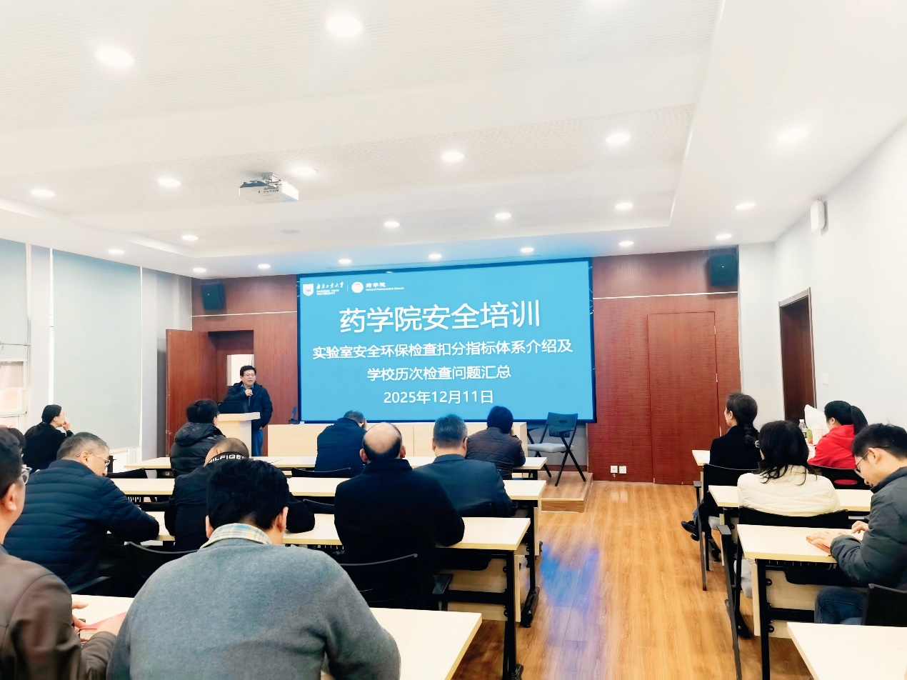 12月11日下午,药学院在尚德楼A1会议室召开全院安全工作会议,开展安全培训。全院教职工,各实验室负责人、安全责任人及安全员代表参会。会议由学院党委书记王飞主持。